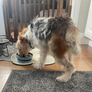Because of her neglect and genetic condition, Gingerbread has received extensive veterinary care. During her dental treatment, a foreign body was found lodged in one of her nasal cavities and had to be removed. She has been treated for numerous urinary tract infections. To help improve her walking, we take Gingerbread for weekly underwater treadmill exercise and integrative joint therapy. She also does some physical therapy exercises at home.